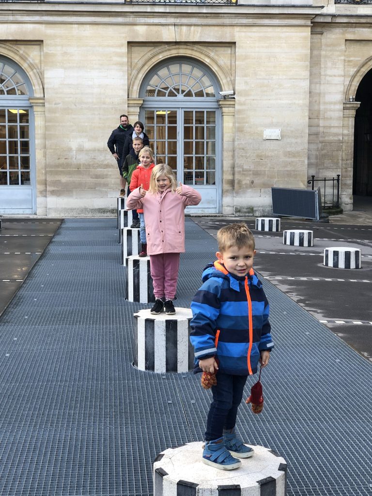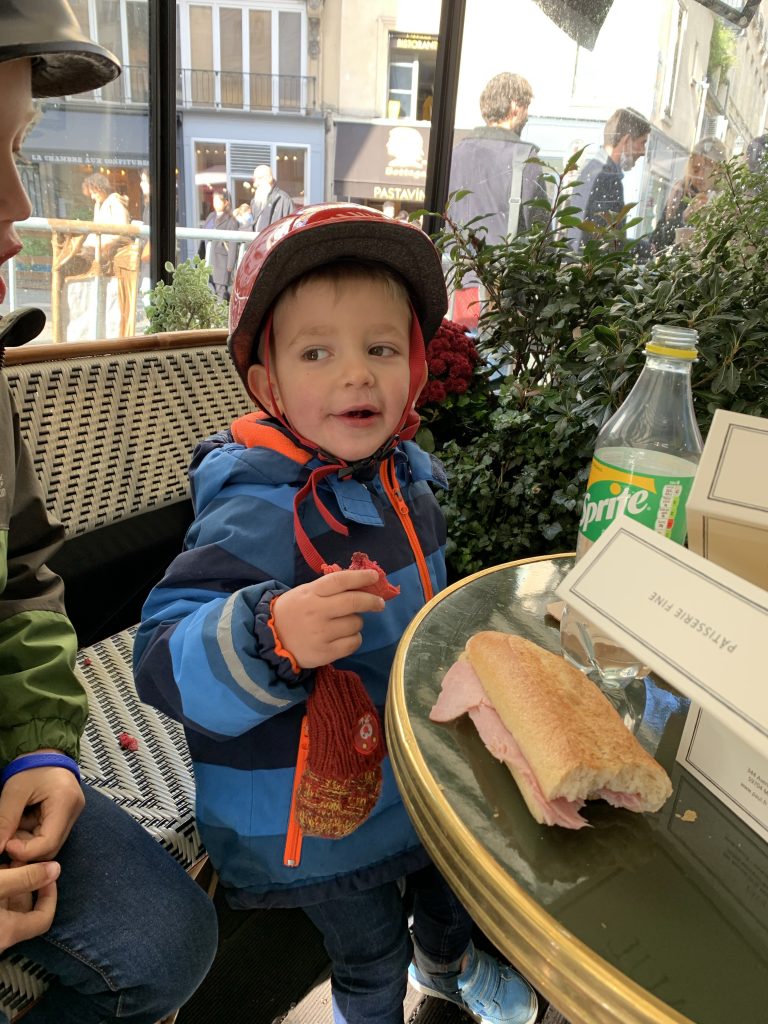 De gids stopte regelmatig: voor weetjes, wat historiek, leuke anekdotes, kunstwerkjes die we tijdens de rit konden zoeken, tijd om foto’s te maken,… dat alles op kindermaat. Zelfs Céleste, die uiteindelijk nog maar 5 (bijna 6) is, stak er heel wat van op. Ze luisterden altijd heel geboeid. Alleen die jongste, die dacht na 2u: het is welletjes geweest, ik doe een dutje… Al was dat maar voor even want kort nadien stopten we bij bakker Paul voor een korte lunch. Wat ons betreft is dat het enige ‘minpunt’; een artisanale bakkerij had leuk geweest. Maurice had direct de macarons gezien (nog eens danku Christel & Joris, heeft hij bij jullie leren eten 😅) en wou dus macarons als lunch 😋 #wegvandeminsteweerstand dus we geven toe …