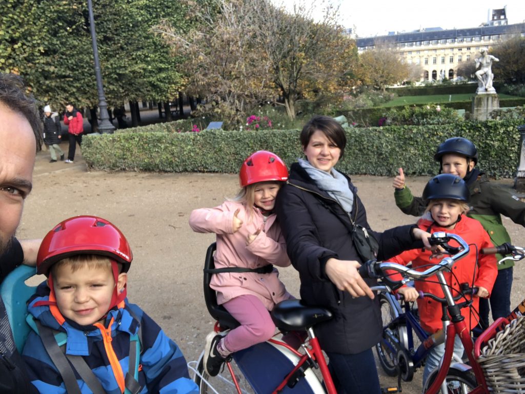 Op naar leuke activiteiten; want Parijs is groot en er is zoveel te doen… De laatste (en voor mij enige) keer dat Bart & ik er waren was de week ná de aanslagen in Parijs. De stad was toen verlaten, doods en kil… niet het beeld dat ik aan Parijs wil overhouden. Ik zit in een paar mamagroepjes op Facebook en stelde daar ook de vraag ‘Tips voor Parijs?’. Heidi kwam met ‘Paris by Bike’ af. Ik was eerst heel weigerachtig: ‘In Parijs, met de fiets, met 4 kinderen?!’ maar ik ging toch op zoek op de website. Ik stuurde een mailtje en kreeg al snel antwoord dat kinderen vanaf 7/8j zelf fietsen, voordien zitten ze op een stoeltje. Alies was een twijfelgeval; omdat de kinderfietsen nogal groot zijn (en Alies niet echt). We gingen er dus vanuit dat er 1 van ons beiden met 2 kinderen zou fietsen; de andere met 1.